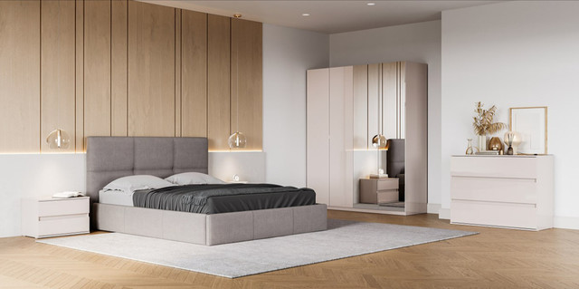 Лілу (Lily) – спальня-новинка, яка стане для Вас простором спокою та ніжності. Улюблене місце у будинку, де панує згода та комфорт. В основі комплекту м'яке ліжко 1.6 м у сірому кольорі та меблі в кольоровій гамі – Кашемір, яка разом створює особливу атмосферу. Деталі узголів'я ліжка нагадують шоколадні плитки, що робить його дизайн мінімальним, і в той же час сучасним. Матеріал невибагливий у догляді, його легко чистити та мити. Крім того, ліжко може бути з підйомним механізмом, що дозволяє зберігати речі в ніші, і таким чином економити простір шафи. У комплект спальні Lily входять також шафи, комод і приліжкова тумбочка, виконані в кольорі Кашемір. На вибір шафа з чотирма дверцятами, де дві з них дзеркальні, на повний зріст або тридверна шафа без дзеркал з мінімалістичним дизайном. Комод та тумби відрізняються фрезерованими ручками, що надає їх вигляду вишуканості та елегантності. Такі ручки начебто приховані, але вони також зручні та практичні у щоденному використанні. Дизайн максимально простий, але цікавий. Будьте впевнені, спальня збереже свій первісний вид на довгі роки, адже якість меблів від MiroMark перевірена роками. Меблі виготовляються з ДСП, які лакують під дією УФ-променів, завдяки чому лакофарбове покриття стає більш якісним та міцним. Фасади шліфують за унікальною технологією, в результаті поверхня залишається ідеально гладкою, майже дзеркальна.