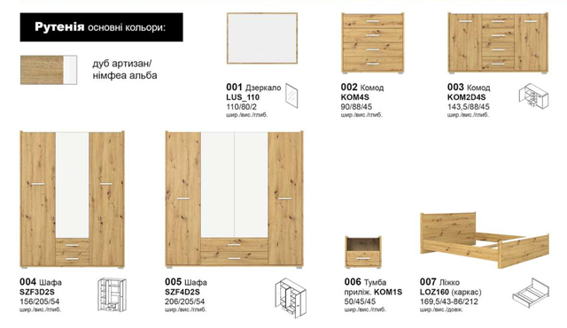 Меблі Рутенія Gerbor – практична колекція від фабрики Gerbor-холдiнг для облаштування розкішної спальні. Виготовляється з ламінованої ДСП (корпус – 16 мм, 22 мм; фасад – 16 мм) в ефектному колірному поєднанні дуб артизан / німфеа альба. Характеризується стильним контрастом, красивим дубовим відтінком, що імітує натуральне дерево, прямими лініями, пластиковими ручками PalMet та ніжками SCHWIN. Використовуються навісні петлі HETTICH та кулькові напрямні повного висунення HAFELE.