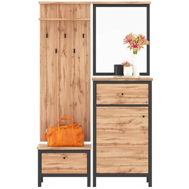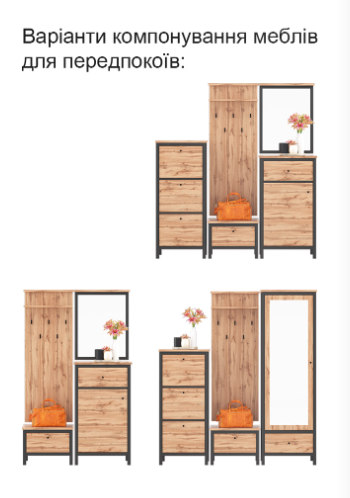 Передпокій Чос Gerbor – комплект меблів у передпокій модульної системи Чос від фабрики Gerbor-холдiнг. Виготовляється із ламінованої ДСП у кольорі дуб тахо / чорний. Характеризується сучасним дизайном, простими формами, контрастними рамками фасадів, що переходять у ніжки, та стильними точковими пластиковими ручками, що підкреслюють геометричність елементів. Використовуються петлі SAMET і роликові напрямні GAMET.