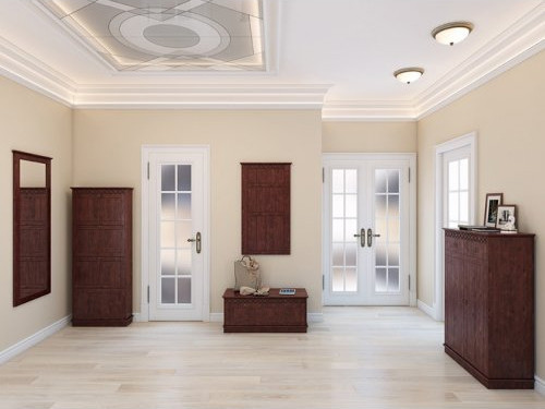 Дуже красиві меблі для передпокою білі з вираженою текстурою дерева насиченого коричневого кольору. Виготовляється з натурального масиву сосни. З безлічі компонентів можна скласти ідеальний варіант своєї прихожої. Складові елементи: вішалка з дерев'яна яними гачками, дзеркало настінне, два комоди різної модифікації, тумба-лавка і велика тумба для взуття.