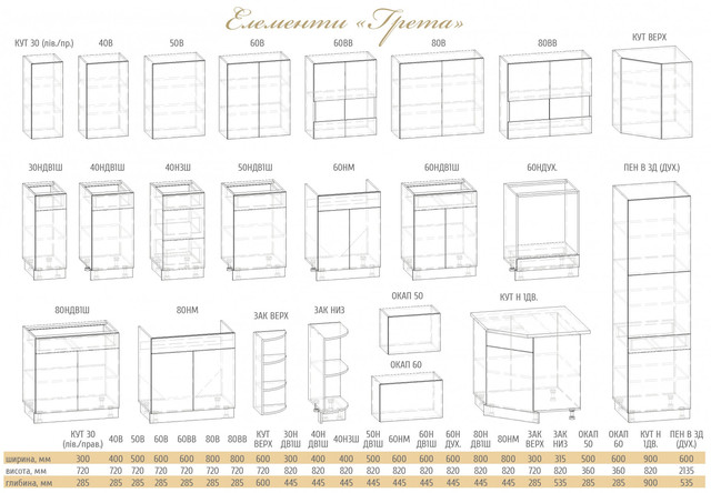 Одна з переваг кухні Грета в тому, що її можна купити як комплектом, так і окремими шафками. Величезний вибір розмірів і форм шафок дозволяє підібрати комплект навіть у нестандартну кухню.