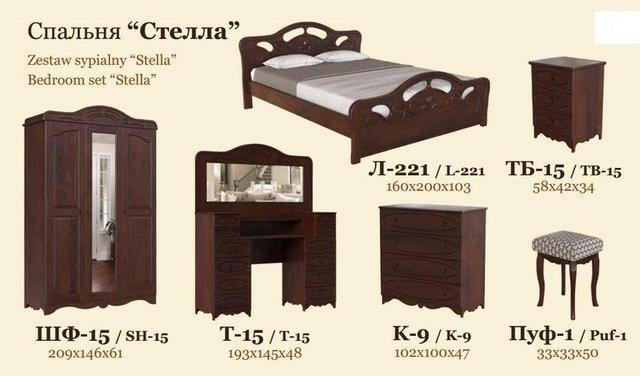 Спальня Стелла - це розкішна спальня, яка нікого не залишить байдужим. Вона створена для справжніх поціновувачів шикарних меблів у класичному стилі. Ця спальня з масиву дерева, екологічно безпечна і надійна по відношенню до інших спалень. Спальні гарнітури з натурального дерева підкреслюють не лише солідність їх володарів, але і свідчать про розуміння хазяїв особливої цінності і якості життя, яким ділиться з нами природа. По надійності ніякий спальний гарнітур не зможе порівнятися з дерев'яна яним.