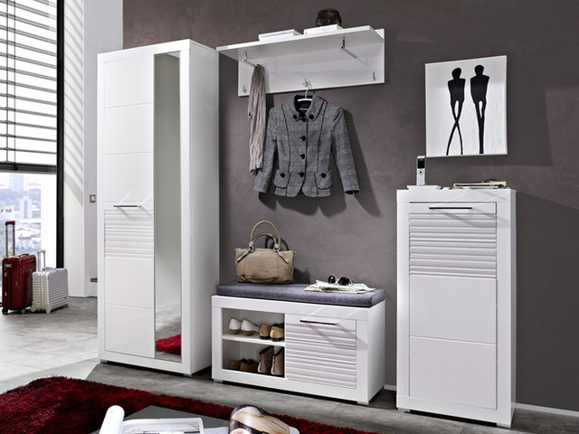 Передпокій ФЛЕЙМС Гербор – сучасний комплект для передпокою з блискучими глянцевими фасадами. Виготовляється з ДСП з елементами МДФ в кольорі білий / білий глянець. Меблі Flames привертає увагу ефектними рифленими вставками, оригінальним поєднанням матових і глянсових текстур. Широкий асортимент практичних і містких елементів дозволяє обладнати затишний передпокій.