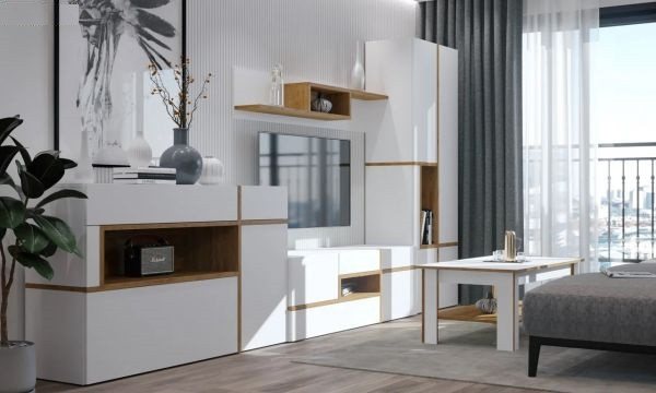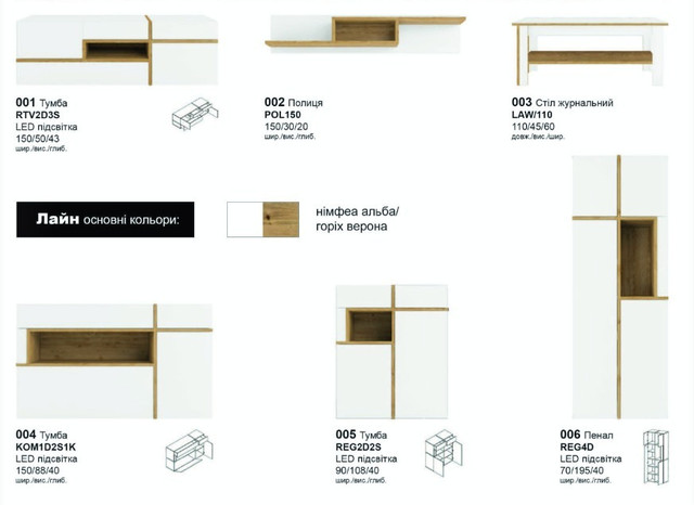 Меблі Лайн Гербор – сучасна колекція від фабрики Gerbor-холдинг лаконічного дизайну. Представлена в приємному колірному поєднанні німфея альба / горіх верона. Характеризується оригінальним підсвічуванням ніш, контрастними елементами, строгими геометричними формами та гладкими фасадами без традиційних ручок, що підкреслює мінімалістичний стиль колекції. Двері та ящики відчиняються за допомогою системи Push to Open Magnet HETTICH (антрацит) легким натисканням на фасад. Використовуються кулькові напрямні повного висування HAFELE та петлі HAFELE. Меблі Line Gerbor легко доповнять вітальню будь-якого розміру.