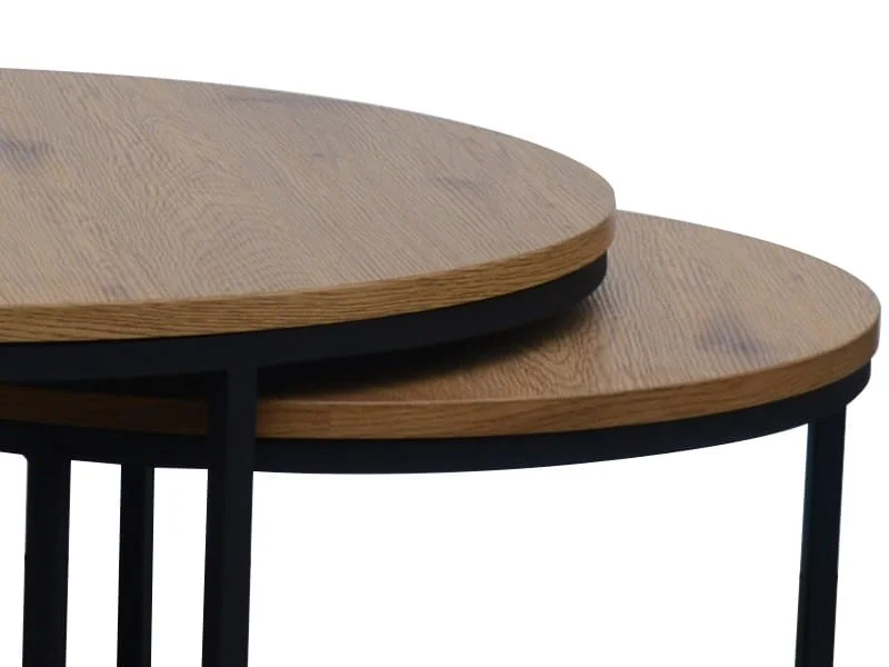 Набір журнальних столиків Atlanta II складається із двох круглих столиків від Signal Meble. Модно оформлена стільниця кольору дуба з чорною рамкою та продумана конструкція забезпечує стабільність та комфорт у повсякденному використанні. Столи, завдяки різній висоті та діаметру, становлять оригінальний набір, який можна встановити у будь-якій конфігурації. Столики підійдуть для сучасних, просторих та невеликих віталень, не займаючи надто багато місця біля дивану.