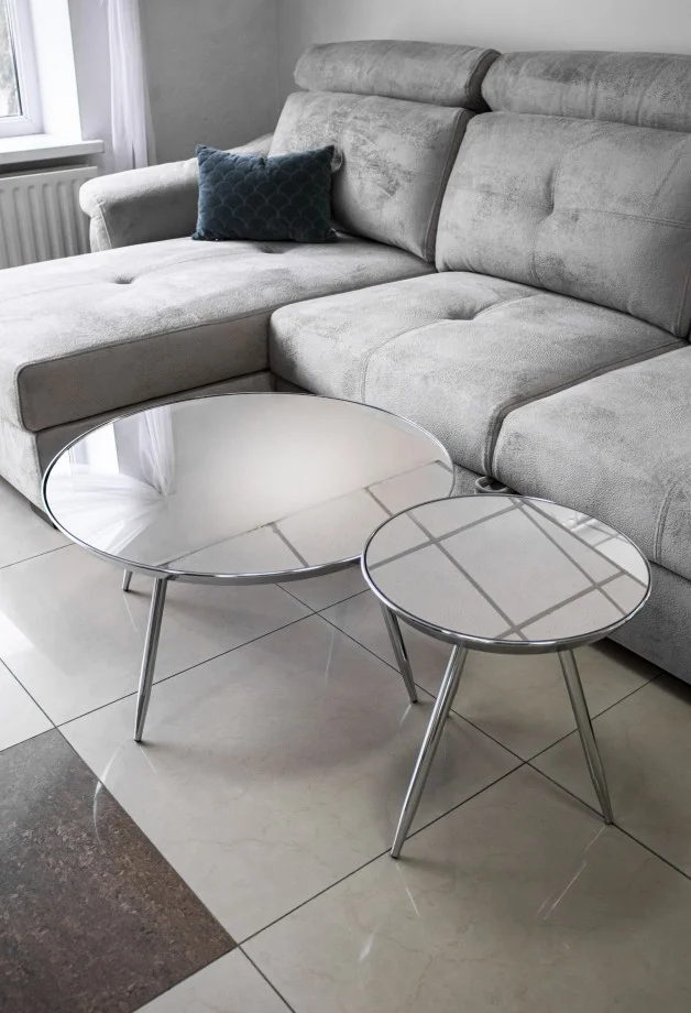 Журнальний столик із загартованого дзеркала в срібній оправі.