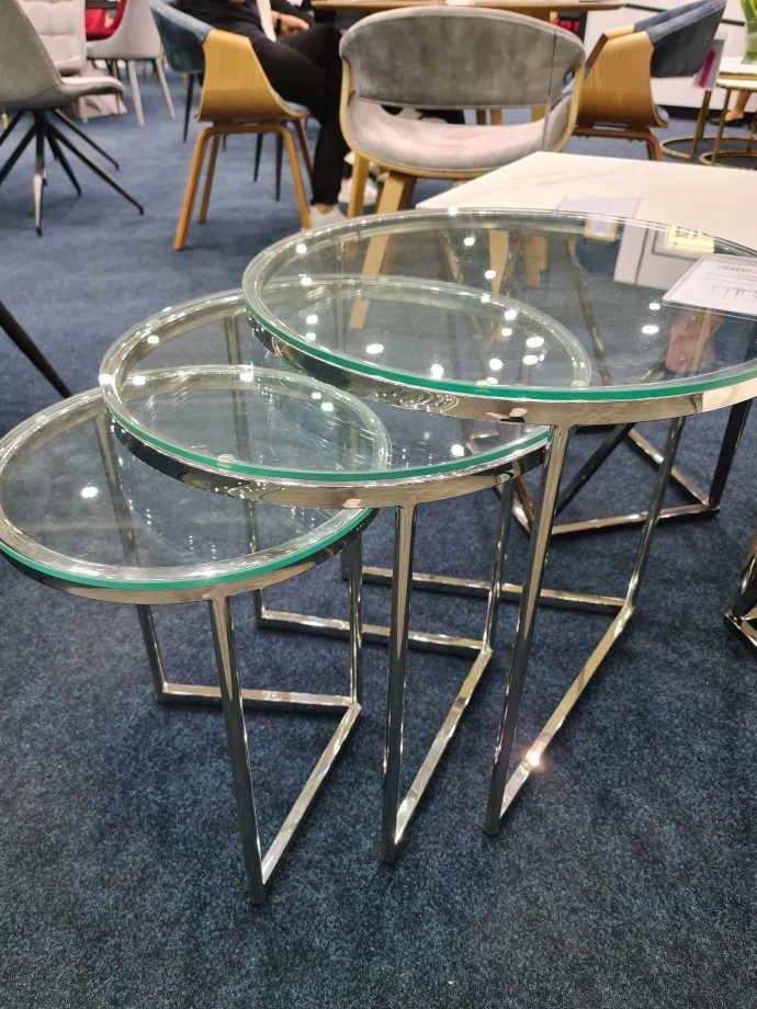 Набір Trinity складається з 3 скляних журнальних столиків в посрібленою рамі. Цей універсальний гарнітур прекрасно гармонує як з класичними, так і з сучасними інтер'єрами. Поєднання загартованого скла і металу висвітлює інтер'єр і відсилає до гламурного стилю, який так затребуваний останнім часом. У комплект входять три круглі лавки, які можна встановити в будь-якої конфігурації, в різному розташуванні. Використовувані матеріали додадуть інтер'єру класу і елегантності. Столи підійдуть для вітальні, холу готелю і залу очікування.