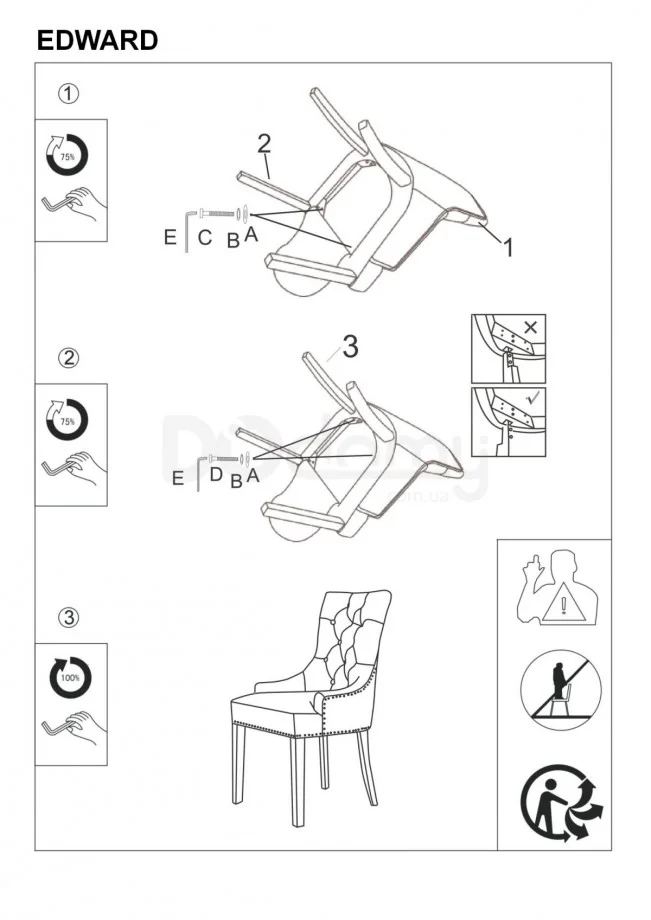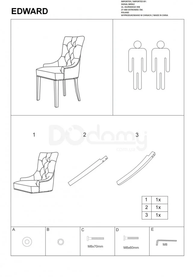 Надзвичайно елегантний стілець Edward - це предмет меблів, який додає стиль і клас інтер'єру у вікторіанському стилі. Крісло обшито красивим матеріалом - темно-синім оксамитом, додатково простьоганних декоративними гудзиками, що надає меблям елегантності. Ззаду на спинці є додатковий декоративний елемент - молоток, що робить крісло оригінальним і неповторним. Меблі оснащена невеликими підлокітниками, завдяки чому сидіти на ній ще зручніше. Крісло Edward має масивні чорні дерев'яні ніжки, воно стійке і міцне.