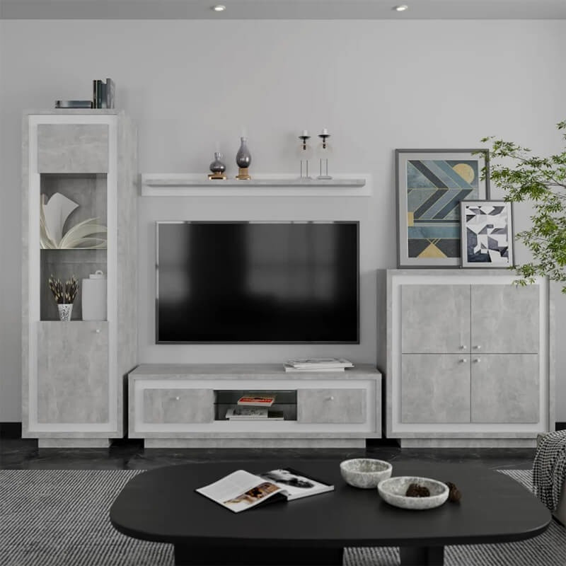 Вітальня Антарес Gerbor– комплект меблів у вітальню модульної системи Антарес від фабрики Gerbor-холдiнг. Виготовляється з ламінованої ДСП товщиною 16 мм (задня стінка ДВП 3 мм) у двох кольорових рішеннях: бетон ательєр / німфеа альба та дуб тахо / чорний.