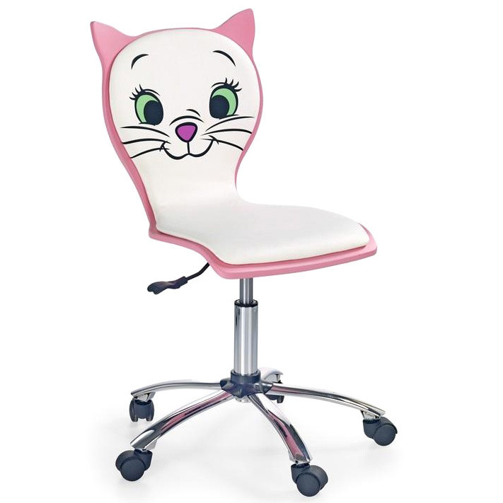 Крісло Kitty 2 Halmar дитяче комп'ютерній ютерне крісло польської компанії Halmar (Халмар) на поворотному каркасі з коліщатками. Зручне сидіння зі спинкою виготовлено з гнутих фанери рожевого кольору. В якості оббивки використана біла екошкіра з малюнком кішечки. Хрестовина виконана з блискучого металу. Висота крісла регулюється за допомогою газліфта від 83 до 95 див.