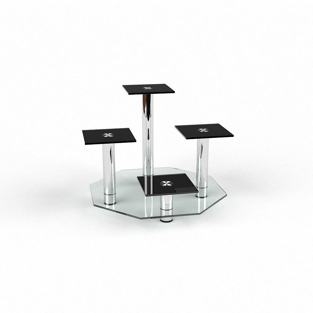 Підставка під вазони Гранд БЦ-Стол ― оригінальна скляна підставка для квітів допоможе красиво оформити зелений куточок у Вашому домі. Стійка конструкція підставки забезпечить надійне розміщення зелених рослин в необхідній частині кімнати. Підставка універсальна завдяки продуманій конструкції. Матеріали: гартоване скло, метал. Підставка оснащена чотирма зручними поличками і великою скляною основою. Полиці пофарбовані в чорний колір.